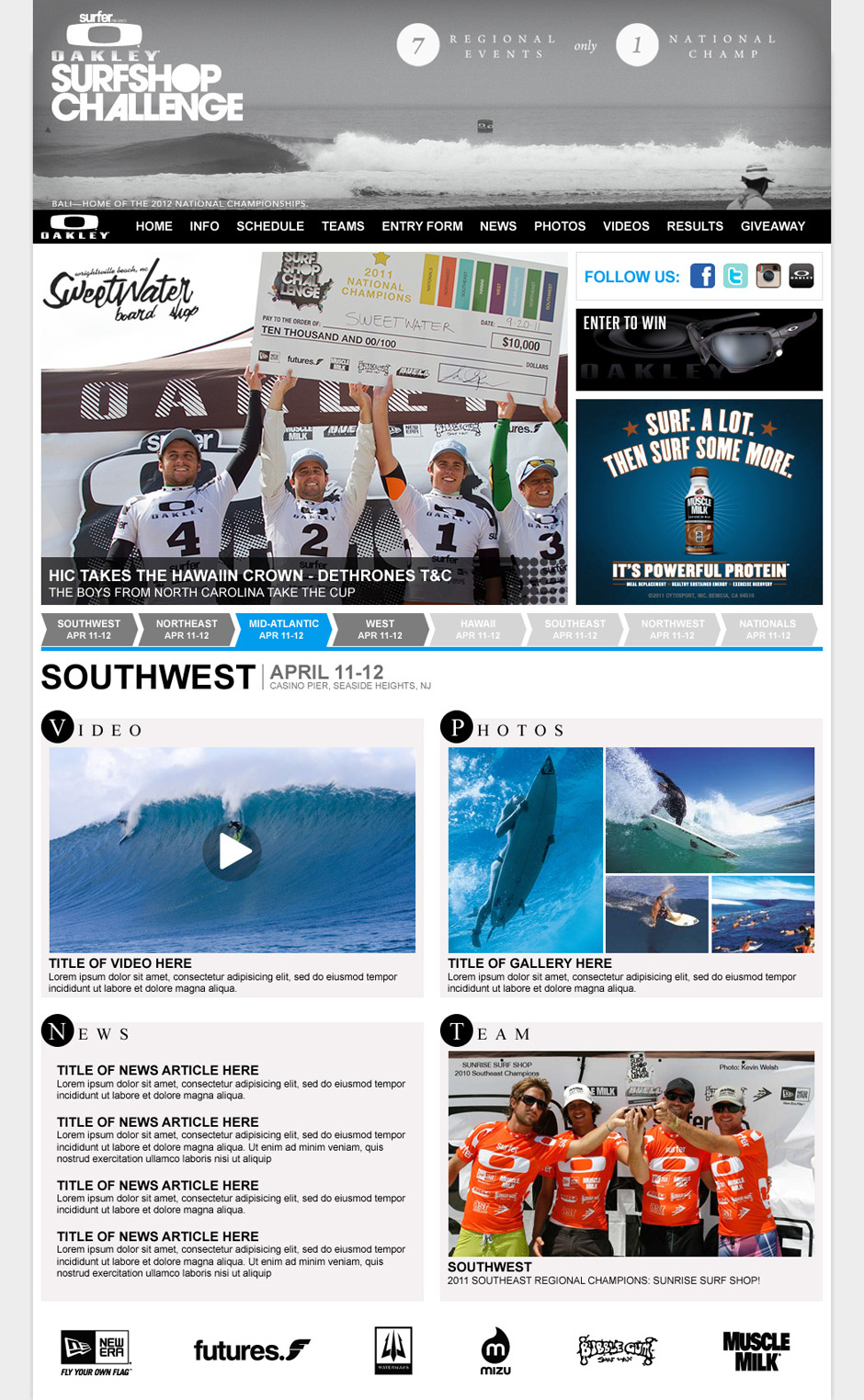 Oakley Surf Shop Challenge I was responsible for creative direction, designing visual concept and overall look and feel for Oakley's tenth incarnation of the team based competitive surfing website. More Info websiteseventspartnershipsmicrositewebdesign2012tengtvoakleysurferwebsurfsitesmotortrenddesign < Newer 6 of 6